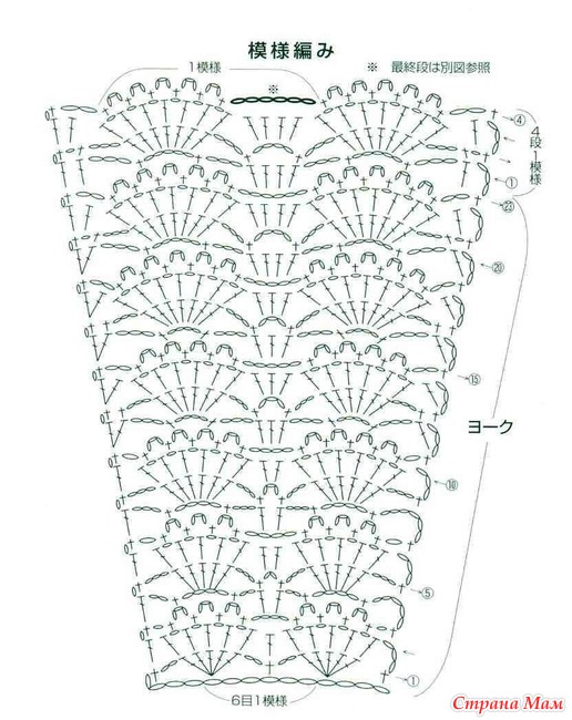 там на уровне груди полотно из столбиков без дырочек. А схема вот такая - но я вязала не ярусами, как на фото, а простым полотном: несколько раз повторила первый веерок по схеме, потом второй...