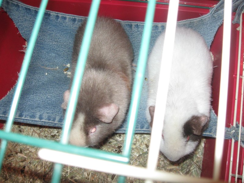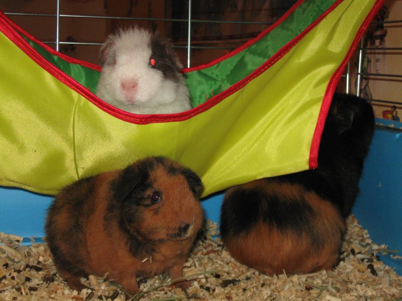 Свинки очень любят гамачки, могут лежать вдвоем, а если не хватает места, то ждут, пока оно освободится. Вот мои давние фото. Цветной гамачок получила в подарок, а джинсовый легко сделать самим из штанины джинсов. Под гамаком тоже любят лежать. А когда подрастают малыши и понимают, что такое гамак, то начинается такое веселье. :-)