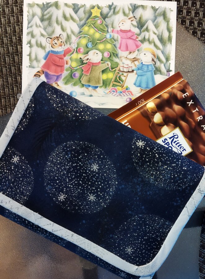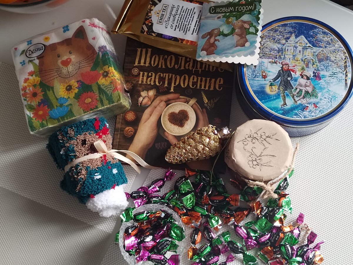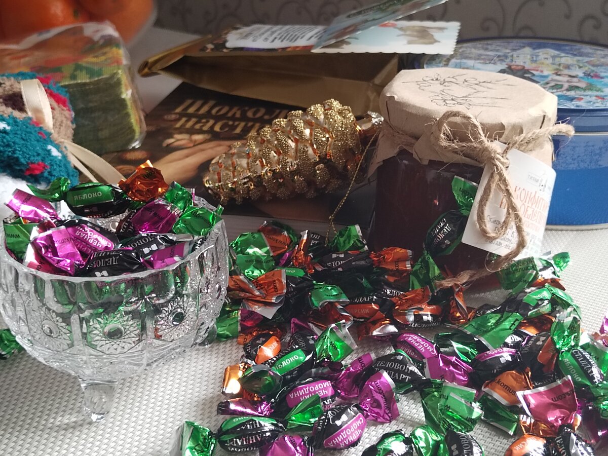 Но нет, кроме конфет, там оказалась ещё целая куча подарков! Итак - книга, чтобы не скучать, и няшные мягкие носки, чтоб не замёрзнуть) чай и печенье в очаровательной банке (я сорока, люблю такие баночки, красиво же ), а ещё конфитюр из облепихи (ооо ) и хрустальная креманка для него) Шишечка (уже на елке ), салфетки с символом года, и открытка, конечно же