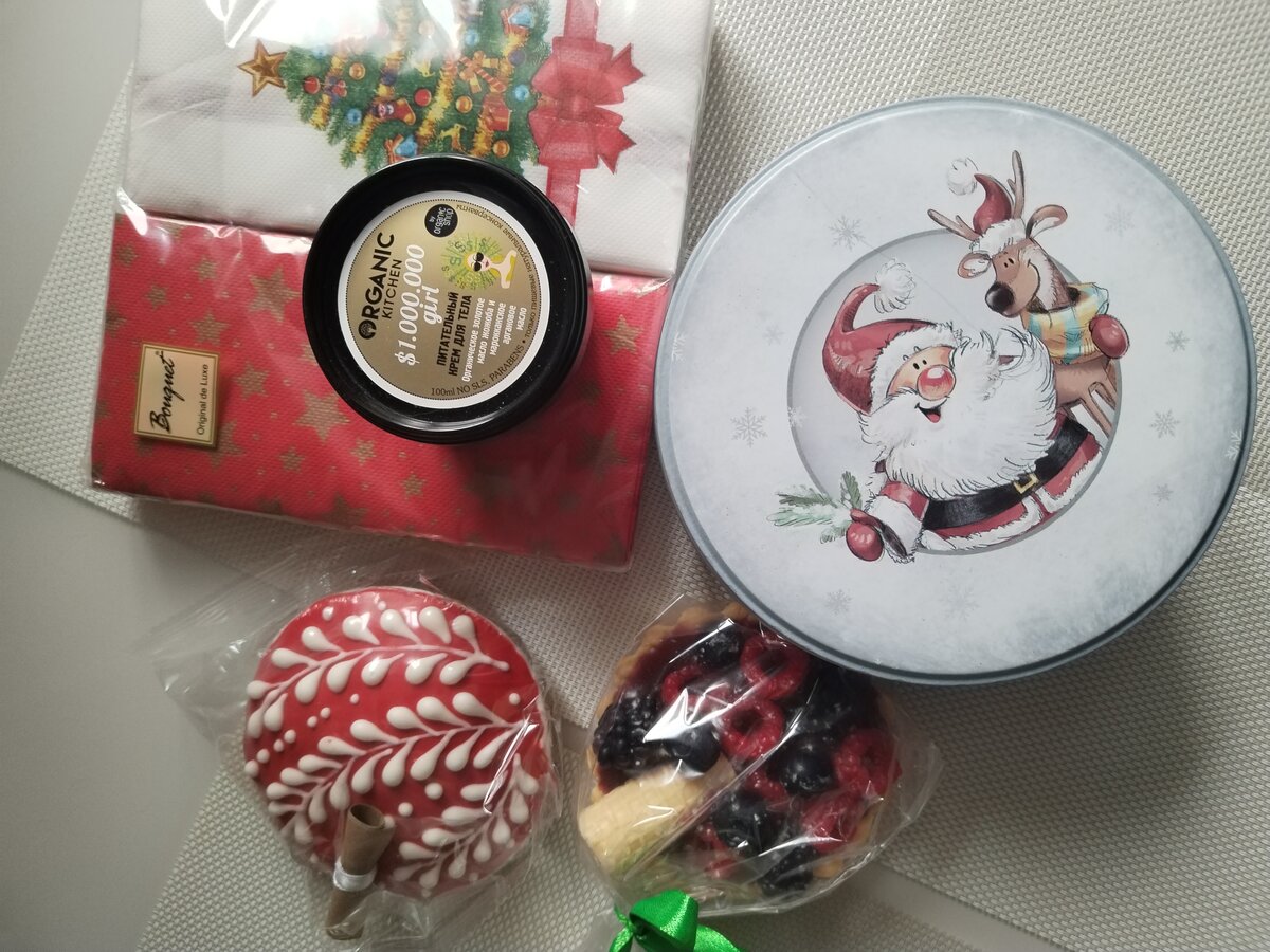 Ещё одна суперская банка для мелочей (ох, люблю я рождественских оленей ) , а там - мм, пряник и шикарное мыло ещё очень красивые салфетки и крем, всегда нужная вещь!