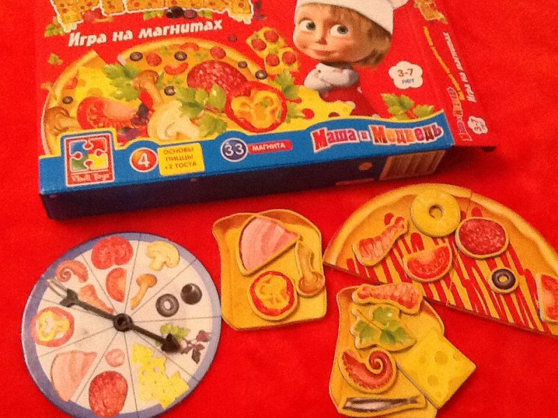 Новогоднее приобретение :-) . Нужно собрать пиццу по рецепту ( гавайская и т.д.). Игроки по очереди крутят стрелку, если попадает нужный продукт-добавляют на основу. Выигрывает первый, кто собрал все ингредиенты.