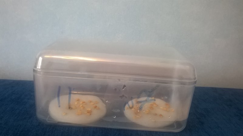 В стаканчик наливала воду (на пару см) и стояло все под лампой. По мере испарения воды - подливала. Ничем не накрывала вообще.