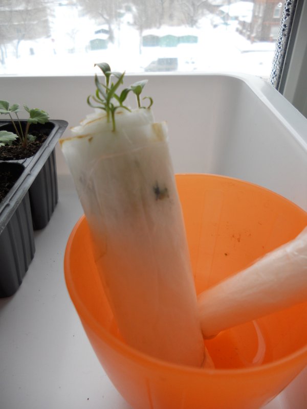 Перец болгарский красный, семена свои, решила попробовать посадить их в "улитку" как Юлия в видео рассказала - подложка+туалетная бумага, свернула в рулончик