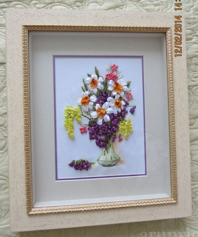 Мой весенний букет, вышитый лентами, с тонировкой. Ваза оформлена специальным корректором по ткани с эффектом стекла. Для придания объема использована техника трапунто.