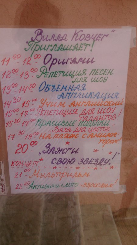 Прилетели мы в Крым 7 августа в 9 утра. Нас встретил хозяин виллы Ковчег и повез на западный Крым, село Поповка. Погода стояла изумительная. Время от Симферополя до Поповки составило 1.35. Дороги конечно атас (вот еще одна причина не ездить по экскурсиям). Теперь про виллу. Все очень понравилось, территория очень ухоженная, все для деток продуманно до мелочей, каждая просьба исполнялась по возможности быстро. Сама вилла огороженна высоким забором,который закрывался, чтоб детки спокойно гуляли и никуда не выходили. Анимация на 100 баллов, девочки умнички. Мы старшую не видели вообще, она постоянно была занята. С маленьким гуляли на площадке,на газоне и в лабиринте. Он у нас даже пошел там для взрослых из развлечений бильярд, теннисный стол, разные настольные игры и вечером можно было смотреть фильм в кинотеатре. И самое что для нас главное после 12 тишина,можно спокойно спать,ни песен,ни танцев,ни пьяных дебоший и посиделок шумных. Для отдыха с детьми просто рай. Еда обычная домашняя,завтрак, обед и ужин. Никаких изысков, но все свежее. Каждое утро,хозяин привозил продукты. На 5 день дочка пережила акклиматизацию, с температурой 39,6, пришлось познакомиться с частным педиатром. Грамотная женщина, мне очень понравилась. Может кому пригодится, контакты под спойлером.