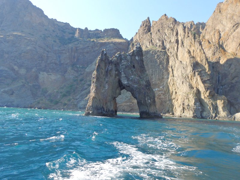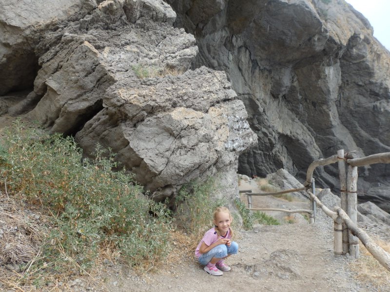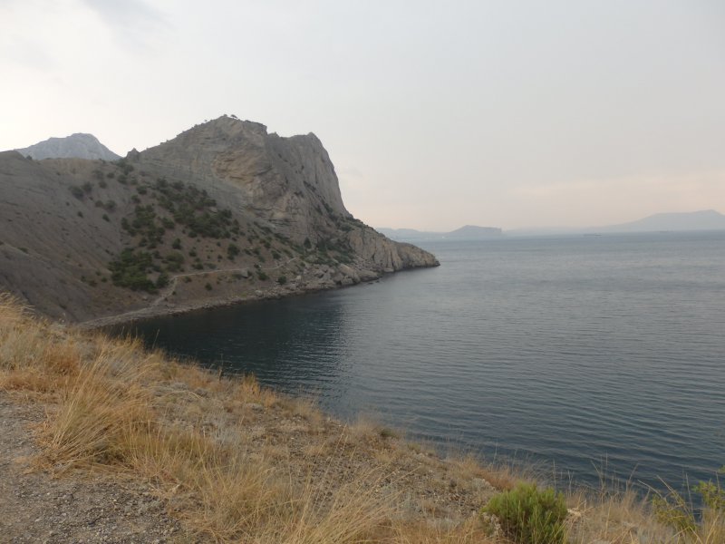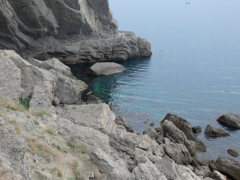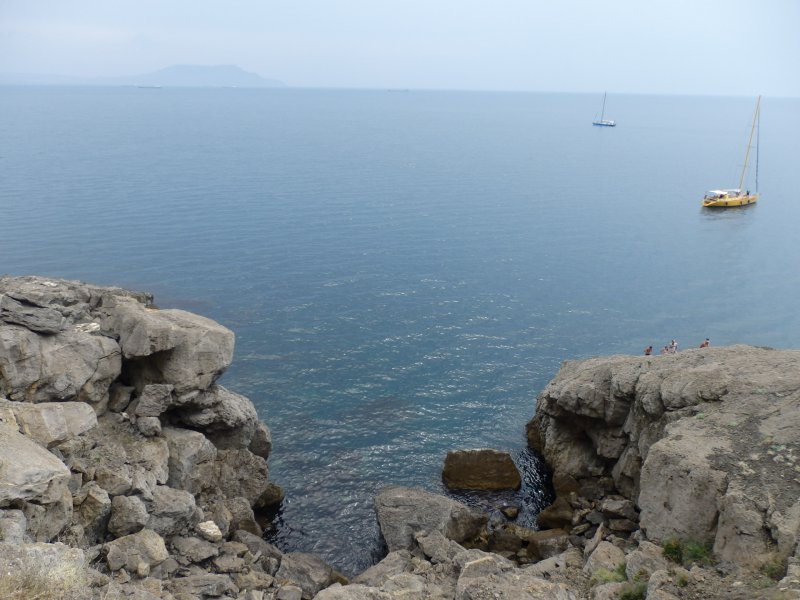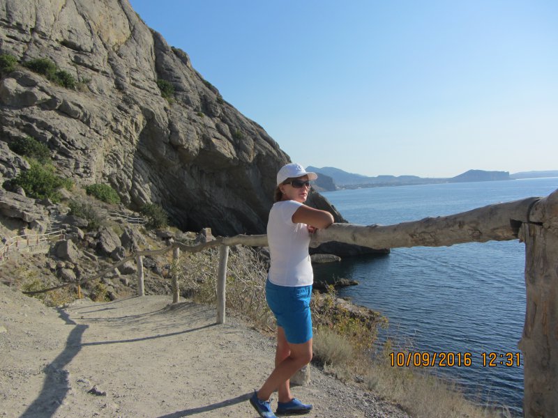 На след.день мы поехали на автобусе в Новый свет на тропу Галицына. Автобус в Судаке 14р. Входных билетов мы не покупали, мы так и не поняли где их берут, вход был свободный.Нам предлагали на берегу экскурсию на катере в один конец, а обратно мол спуститесь с тропы сами, но мы решили туда идти сами, а обратно видно будет.Меня не впечатлила тропа абсолютно.Опасно конечно в некоторых местах, особенно если над тропой нависают такие огромные скалы, но мы прошли всю тропу, прошли все бухты, увидели царский пляж и захотели там искупаться.Долго искали как спуститься к нему,потом решили прямо со скалы по-тихоньку спускаться.Когда спустились, посмотрели наверх где мы были, обуял ужас, неужели мы это сделали.Пляж оказался уютным, красивым, а водичка такая чистая, не зря же царь Николай- 2 там купался.Туда катера привозят и увозят людей, прямо к этому пляжу.Обратно мы пошли тоже пешком по можжевеловой роще.Решили, что все кг.,что наели на Азовском море нужно срочно убирать.Вообщем км.мы прошли в этот день достаточно. Но вечером мы снова пошли гулять на набережную в Судаке.Новый свет мне не понравился вообще, сплошные гостиницы и т.п.друг на друге,тесный какой-то,нагромождение домов и все. Не сравнить с Судаком, где простор и есть где разгуляться.