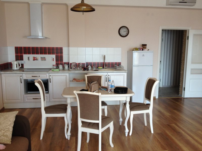Отдыхали мы в сентябре 2016, двое взрослых и ребенок 1,2 года. Главным образом из-за ребенка искали именно варианты с кухней, т.к не особо хотелось заниматься поисками кафе с детским меню или подстраиваться под отельную еду.