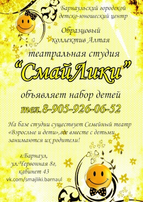 Творческая студия "ТеатралочкА" продолжает набор детей в группы от 10 лет. Скромным и нерешительным ребятам мы поможем обрести уверенность в себе, а энергию особо активных направим в нужное русло. Занятия проходят в театре "Спичка", по адресу: ул. Ползунова, 37. Набор ведет художественный руководитель театра "Nahaliro" К. С. Иванченко. Приходите, будет весело!)) Первое занятие бесплатно. Справки по телефону 923-650-7054.