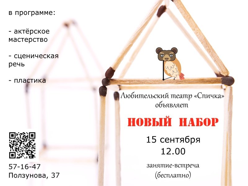 теАRТральная площадка «СПИЧКА» начинает набор новой группы по актёрскому мастерству (от 18-ти лет и старше).