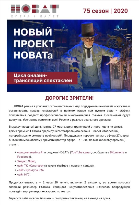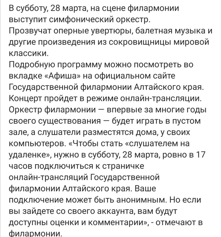 Концертный зал "Сибирь" сообщает, что с 24 марта 2020 года по 9 апреля включительно согласно приказу Министерства культуры Алтайского края "О введении дополнительных мер в краевых государственных учреждениях культуры в целях предупреждения распространения коронавирусной инфекции" отменяются и переносятся концертные мероприятия: