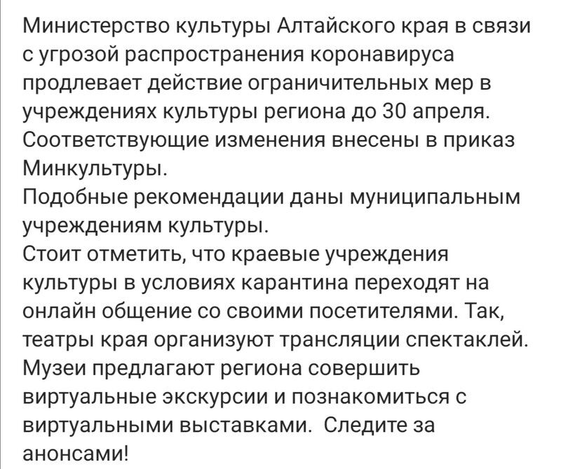 🥳Музей будет работать в режиме, предусматривающем прием индивидуальных посетителей без проведения массовых и иных мероприятий; остается актуальным запрет на работу с организованными группами посетителей (на основании приказа Минкульта Алтайского края №172 от 22.06.2020 г.).