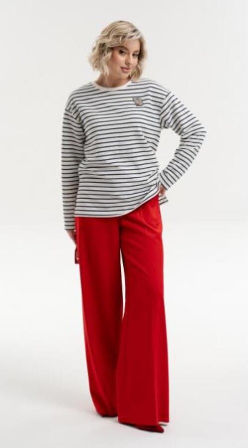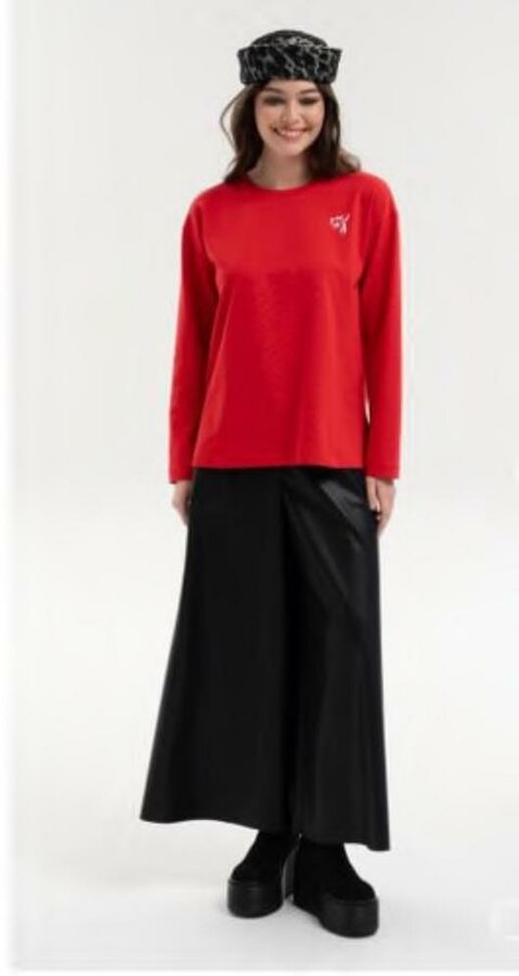 1 Лонгслив свободного кроя со спущенной линией плеча и разрезами в боковых швах. Приспущенная линия плеча и разрезы в боковых швах создают расслабленный современный силуэт. Широкий рукав полной длины. Лаконичный дизайн дополнен аккуратным бархатным принтом на груди в виде "золотой рыбки" Цвет - красный (70% - ВИСКОЗА, 25% - ПОЛИЭСТЕР, 5% - ЭЛАСТАН) 2500