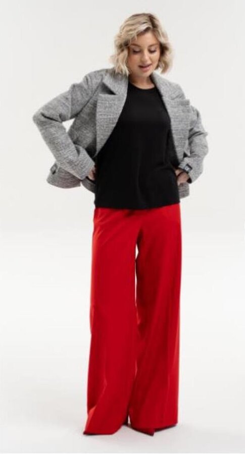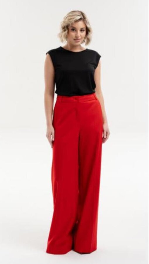 2 Брюки - "палаццо" из костюмной поливискозы. Комфортная посадка на талии, притачной пояс с резиной, застегивающийся на крючок - делают брюки идеальными для любой фигуры. Цвет - красный (65% - ВИСКОЗА, 32% - ПОЛИЭСТЕР, 3% - ЭЛАСТАН) 4200