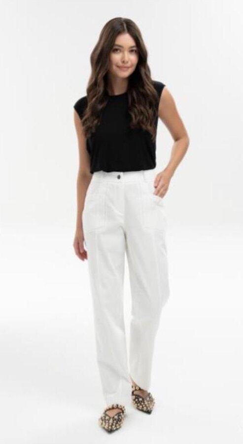 39 Стильные силуэтные брюки на любой для нарядных и элегантных образов. Стрелки придают силуэту изящество, зрительно вытягивая ноги. Комфортное сочетание шерсти, шелка и вискозы обеспечивают идеальную посадку и сохраняют тепло и уют. NEW PREMIUM QUALITY Костюмная ткань с шерстью и шелком премиального качества жемчужного цвета (67%п.э., 20%вискоза, 4%шелк, 4%шерсть, 5%спандекс) 4500