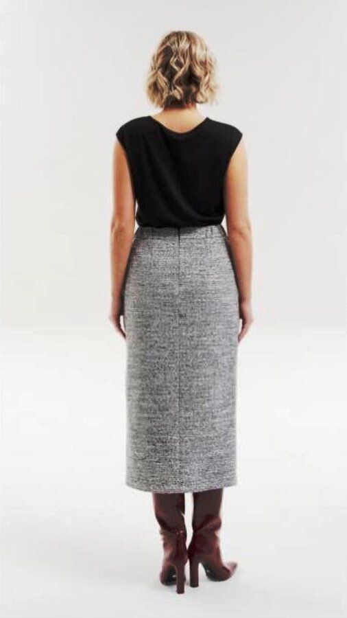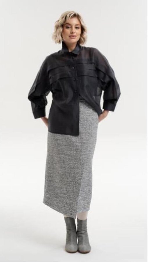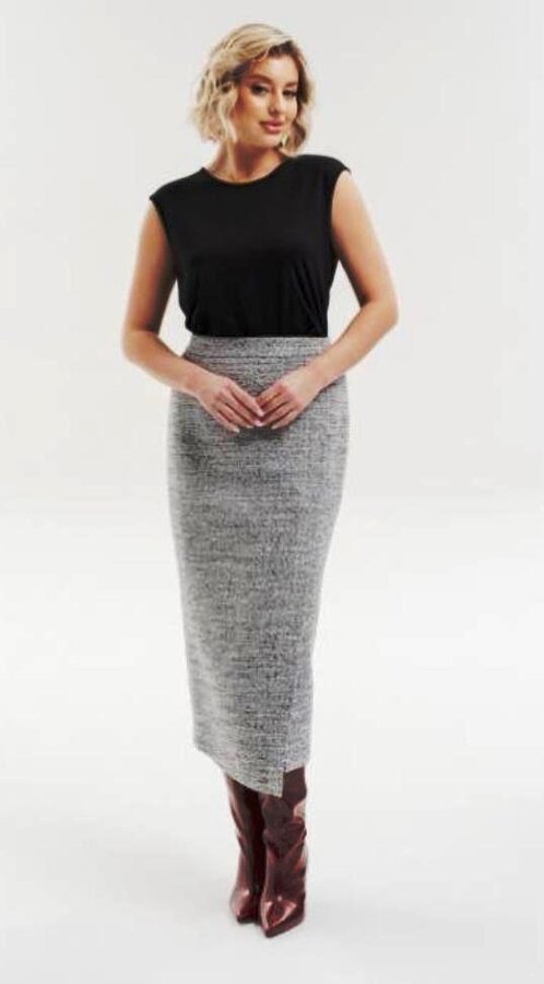 4 Юбка-карандаш длиной midi с эффектом запАха. Высокий разрез, смещённый влево, создаёт выразительный акцент и добавляет модели динамики. Потайная молния в среднем шве юбки. Юбка на подкладе. Цвет - черный/молочный (50% - ХЛОПОК, 35% - ПОЛИЭСТЕР, 15% - ВИСКОЗА) 3700