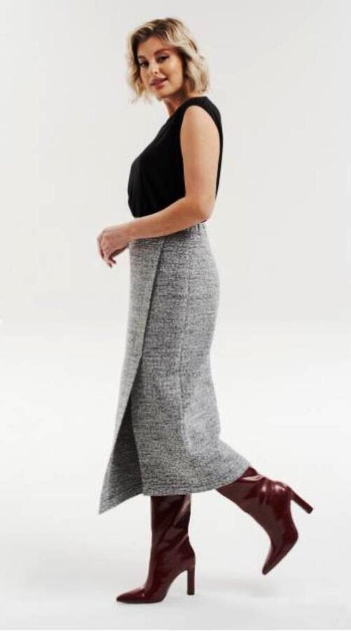 11 Юбка А-силуэта с эффектом на запах с посадкой на линии талии с боковыми карманами и декоративными отстрочками создаёт геометричный архитектурный акцент и прекрасно комплектуется с жилетом в той же ткани. Premium quality Костюмная ткань премиального качества, рогожка светло- бежевого цвета ткань с фабрики Burberry. Италия (100% шерсть) 4900