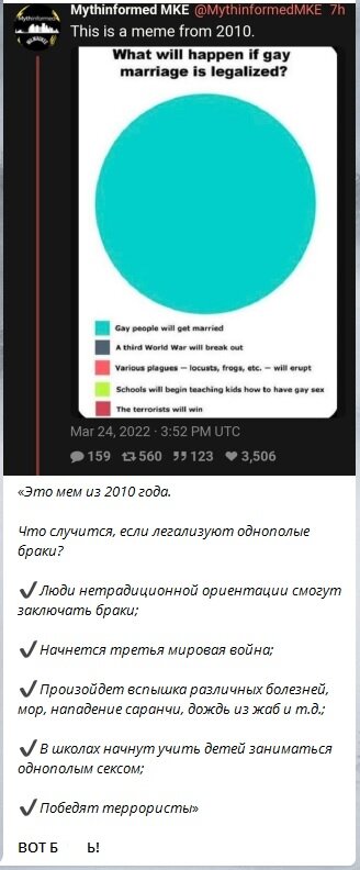 Вас то всяко никто насильно в ЛГБТ тянуть не будет. Взрослый, психически устойчивый человек, врядли так легко засомневается в своей гендерной принадлежности или сексуальной ориентации. Целевая аудитория - дети, и чем младше - тем лучше, за которую и идет борьба. Им можно внушить что угодно. А потом уже дожимать... И когда "такие" мультики в детском саду будут показывать Вашим внукам, а Ваши дети будут их называть "Оно", ситуация уже не будет столь лайтовой. А если в 12 лет эти внуки затребуют гормональную терапию, которую ни Вы, ни Ваши дети не смогут запретить, потому что право на нее закреплено на законодательном уровне, а здравый смысл и критичность мышления не помогут Вам убедить себя, что это не блажь, а тот самый редкий случай, когда природа реально ошиблась, тогда уже и ажиотаж вокруг темы перестанет казаться такими искуственным и незначительным. |