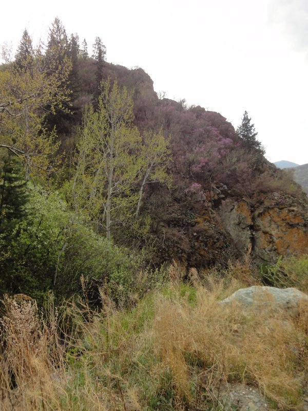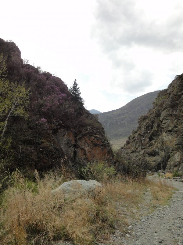 В целом же - растительности в Горном еще не очень распустилась - особенно это чувствуется в высокогорье - после Семинского перевала часто видели снег вдоль рек. И травы совсем немного. Листва только-только начала распускаться.