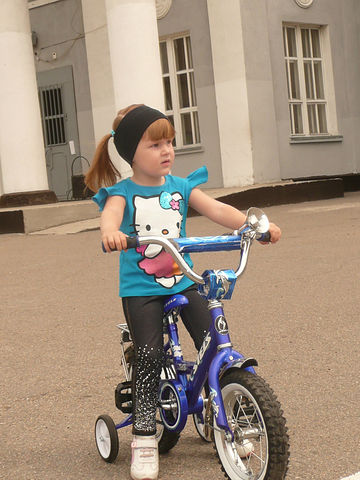 нашей дочери бабушка с дедушкой на ДР(на 2года) подарили 2х колесный вел,а сзади еще два маленьких.Мес.3 присматривалась к нему,то катала по кв-ре,на какое то время вообще про него забыла,потом стала педали крутить,а потом и рулить.В общем,поехала она в 2г.4мес.Сейчас во всю гоняет(на фото2г.8мес.примерно) и тормозит лихо и по ситуации и объезжает ямы,когда надо к обочине съезжает,чувствуя опасность в виде машин.