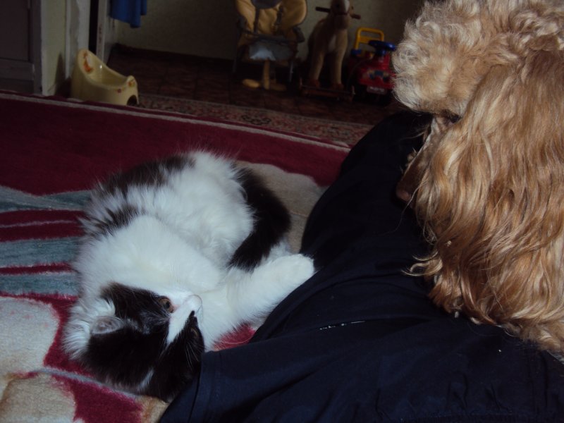А у нас сначала появился пуделек, через год зимой в подъезде появился маленький котенок, в клинике сказали что кошечка 3 мес,