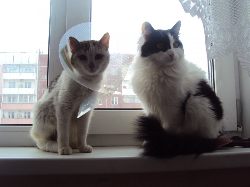 в этом году в марте на работу пришла кошечка еле живая. отнесли в клинику, оказалась гангрена хвоста, открытый перелом ножки задней и сильное обморожение. хвостик пришлось ампутировать, нжку лечила 2 месяца, думали будет не рабочей, зажило. осталась у нас, кот ей свой домик подарил и миску. ходят парой.