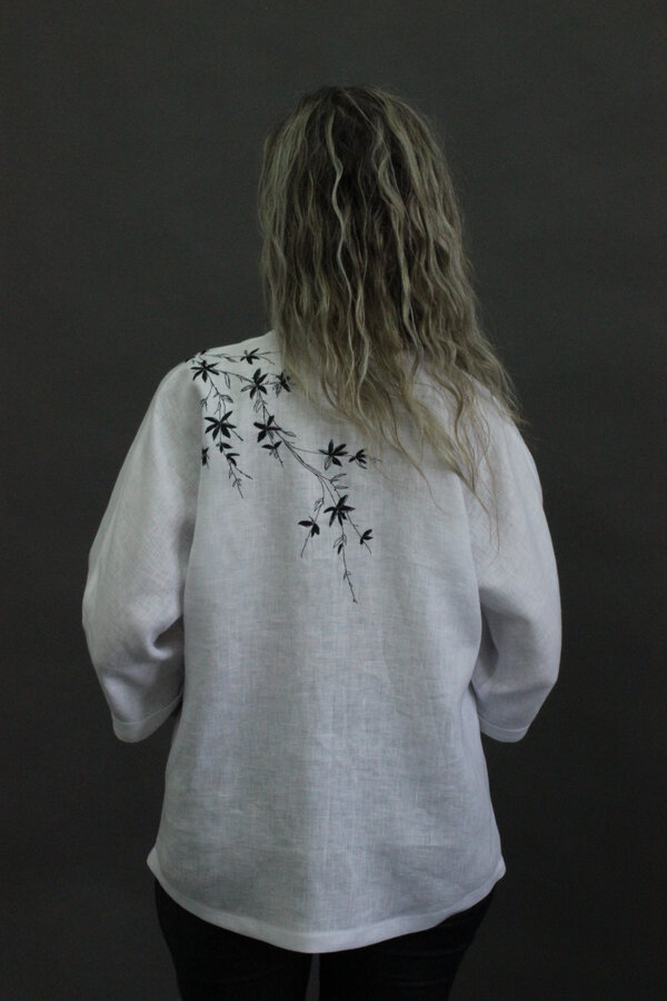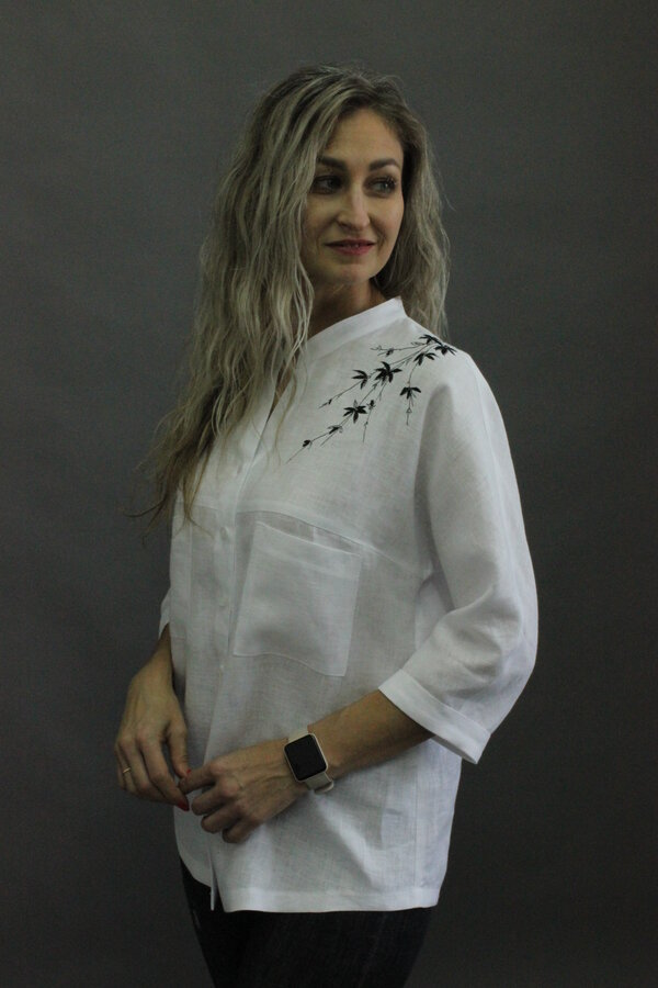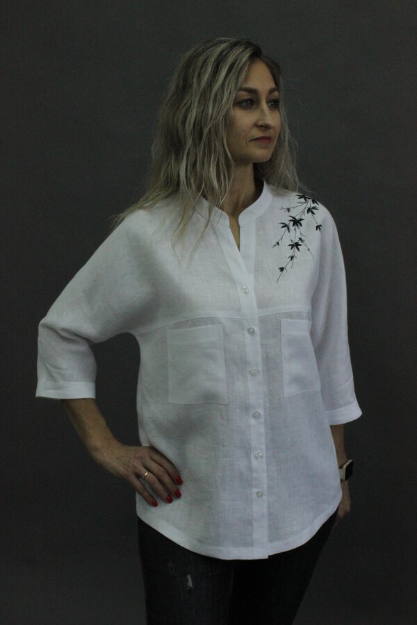 Блузон с цельнокроеным рукавом ¾ и манжетой. Полочка с кокеткой и накладными карманами. Сквозная застёжка с планками. Воротник – стойка. Полочка и спинка декорирована вышивкой.