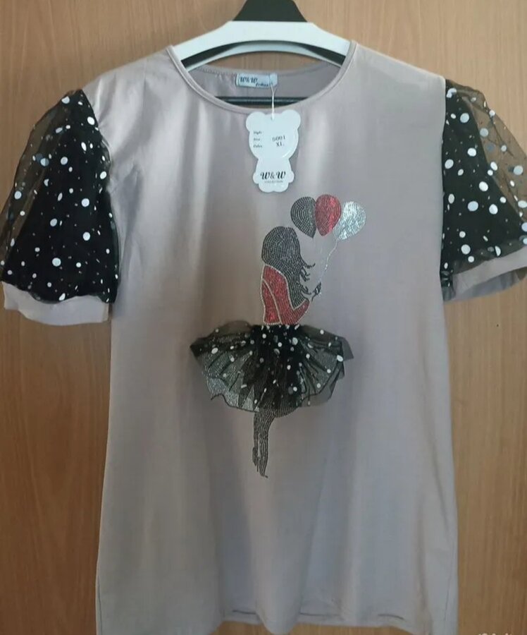 свободный силуэт, очень красивые рукава и подол с капельками.