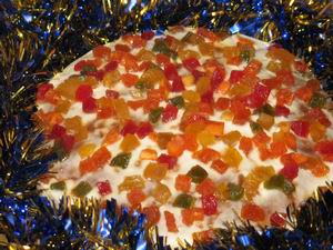 Когда манник испекся, вынула его из духовки, сделала много-много-много проколов деревянной лучинкой, полила медовым сиропом, слитым с цукатов, не вынимая из разъемной формы, промазала сметаной с сахаром, покрыла цукатами и поставила на 10 минут в духовку, отключив ее. Через 10 минут достала, потом остывший осторожно вынула из формы.