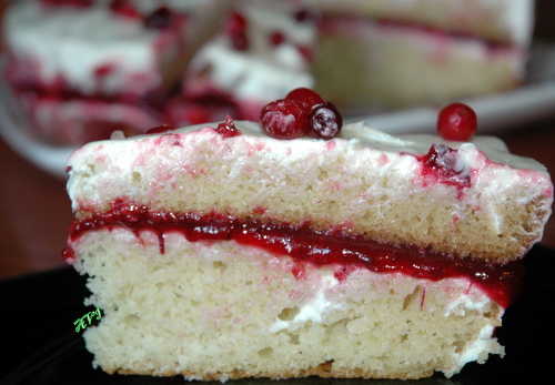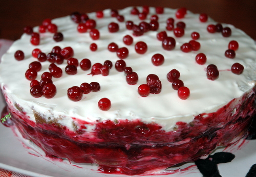 Разъемную форму выстелить пищевой пленкой. Выложить в форму 1 корж смазать половиной белого крема, потом выложить кисель, далее второй корже залить второй половиной сметанного крема. Торт поставить в холодильник на ночь, еще лучше на сутки. Снять разъемную форму. Бока смазать киселем и украсить свежими ягодками клюквы и сахарной пудрой.