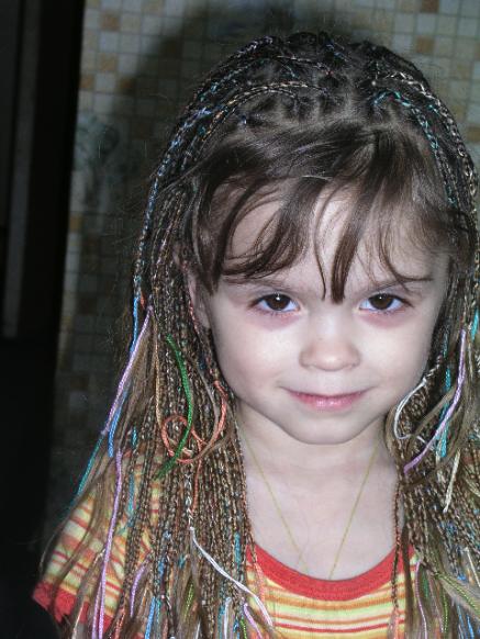 89 косичек,за два дня как Наташа выдержала я не знаю,но спустя два года мы заплетали 97 штук на подросшие волосы.Фото найти не могу.