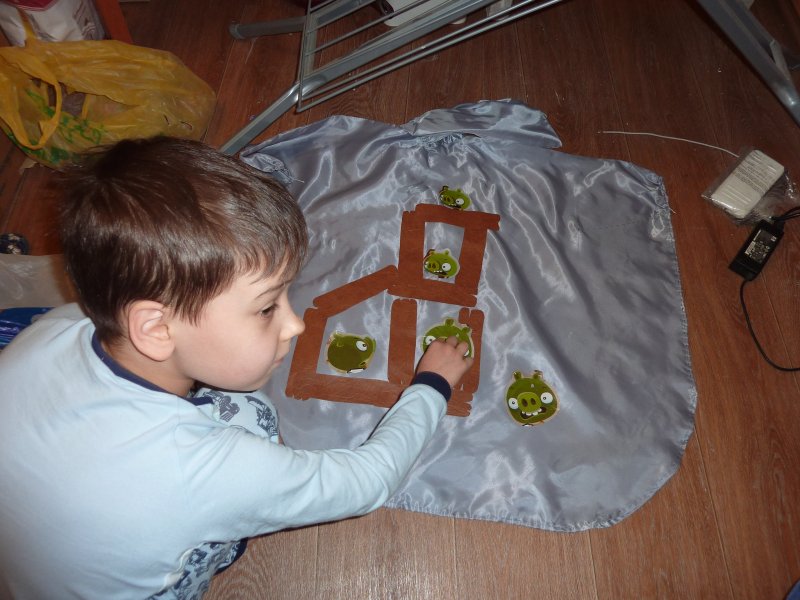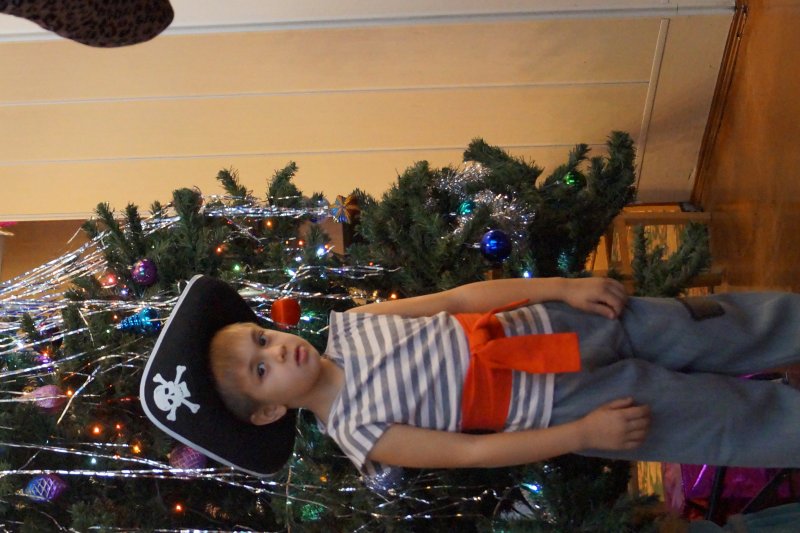Степану 5 лет.Захотел костюм пирата,пришлось маме за машинку садиться. Пират получился у нас мирный без сабель и пистолетов,ну не держим мы дома такие игрухи,мы за мирное сосуществование .Всё кроме шляпы сшилось моими очумелыми ручками из старых запасов ткани.В магазине не нашла тельняшечной ткани,пришлось подобрать более менее подходящую по типу ткань,ну а брюки как то сами подобрались в комплект.а на брючки пришили заплатку для достоверности-ну где вы видели пирата в новых штанах?