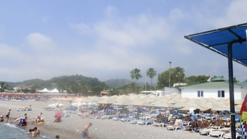 Море чистое, на пляже мелкая галька, все бы ничего,если бы россияне не пьянствовали на ночном пляже и не мусорили, а то утром приходишь, а на пляже- пустые бутылки,стаканы, посуда,взятая из ресторана отеля...ну противно. Иногда мы устраивались на лежачках на пляжах рядом стоящих дорогих отелей, там никто не проверял.