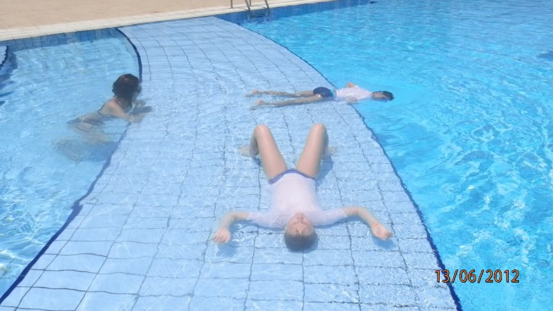 Народа даже в самую "загруженность" в бассейне нету-хотя лежаки все заняты-плавать можно спокойно.Мои ныряли до упаду-никому на голову не попали)))))))Хотя тут же проходит и аэробика, и водное поло и всякие конкурсы Чистенький.Думала скользко у края бассейна-а нет, там резиновые штуки какие-то(как решетки-похоже как раз тужа и льют потом очиститель(или чем они там чистят)-на ночь эту резину в катушки скатывают.