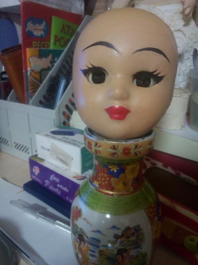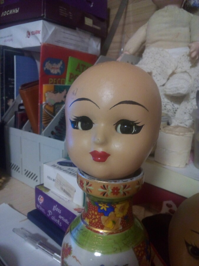 Сначала вот эта цыганочка. Она была не в худшем состоянии, уцелела часть росписи фабричной: все, что слева, справа большая часть брови и губы, кроме скола сверху справа. Я получается не расписывала, а скорее подправляла дефекты.