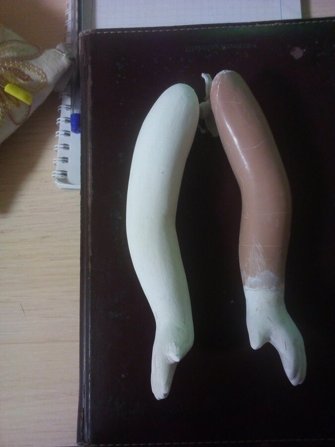 И новый этап эпопеи с цыганками! Покраска. Не удивляйтесь, что смуглая только одна ручка. Это как раз та, что я слепила, все же тело я не красила, поскольку оно в приличном состоянии. Совсем светлые детали - это тело опилочной грузинки, его пришлось красить полностью, т.к. было сплошное осыпание краски, сохранять нечего.