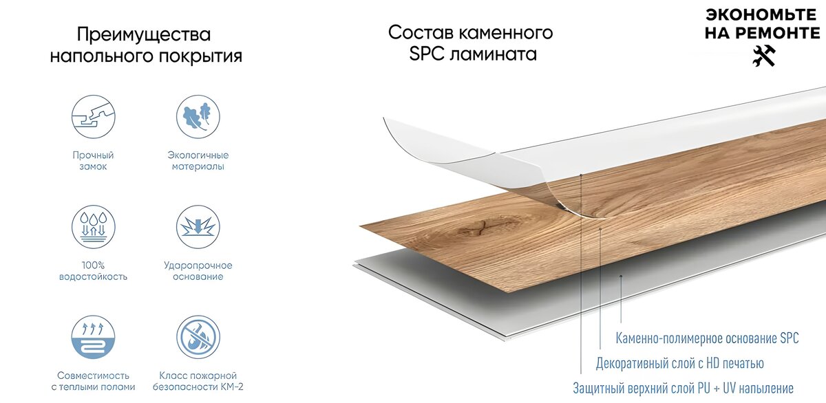 2. SPC (Stone Plastic Composite) — «Каменная броня» В основе — известняк + полимер. Это очень твердая плита.