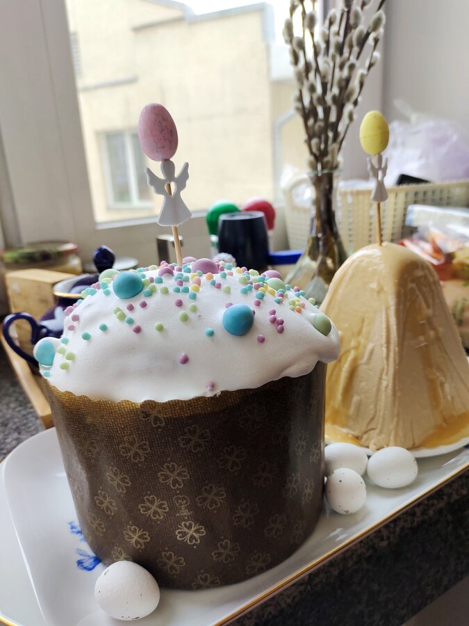 Мы - традиционно, куличи творожные, глазурь желатиновая. Попробовала готовую - не понравилось. На шоколадный кондитерскую глазурь использовала для рисунка и гнездышка с яйцами (из молда силиконового). Ну, вы такое уже видели. У меня жутко консервативная семья, они эксперименты не любят.