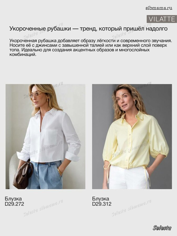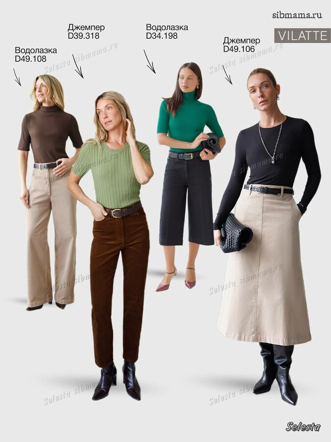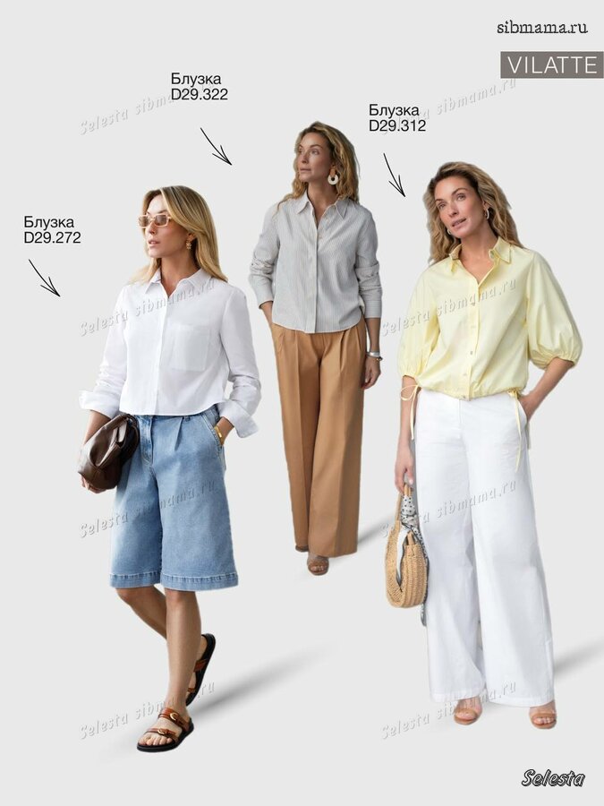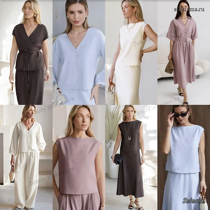 В двух оттенках: палаццо, брюки-бананы, юбка на запа́х, платья, топ, блузки с кулиской, в стиле сафари и с коротким рукавом.