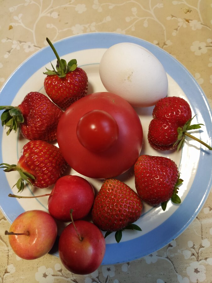 Вообще я не была поклонницей ремов,наверное мне не везло с сортами или я требовала от них слишком много. В этом сезоне я решила выращивать ремы как одноразовые поздние сорта и влюбилась в отдельные сорта. Это последний сбор, томаты и ранетки для понимания сроков, а яйцо для понимания размера