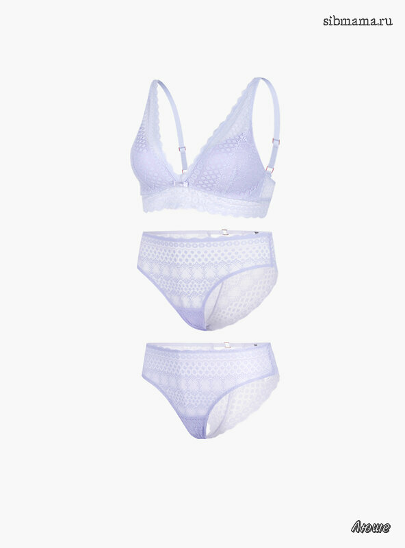 Комплект нижнего белья от торговой марки Индефини. В комплекте бюстгальтер и двое трусиков. Бюстгальтер сиреневого цвета, из кружевной ткани, без косточек, без Push-up, с плотной формованной чашкой, с кружевным обрамлением, лямки регулируются. Трусики, стринги и слипы, сиреневого цвета, из кружевной ткани, с декоративным вырезом сзади, на мягкой резинке. К бюстгальтеру идут трусики, размерами: 75B-S, 75C-M, 80B-M, 80C-L.