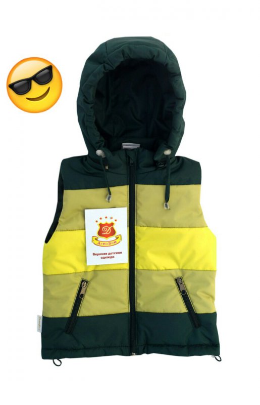 Новая с этикеткой детская жилетка фирмы Детизим. С утеплителем. ТЕМНОЗЕЛЕНАЯ с жёлтым вставками. Размер 104. По спинке длина 40 см, ширина 37 см.