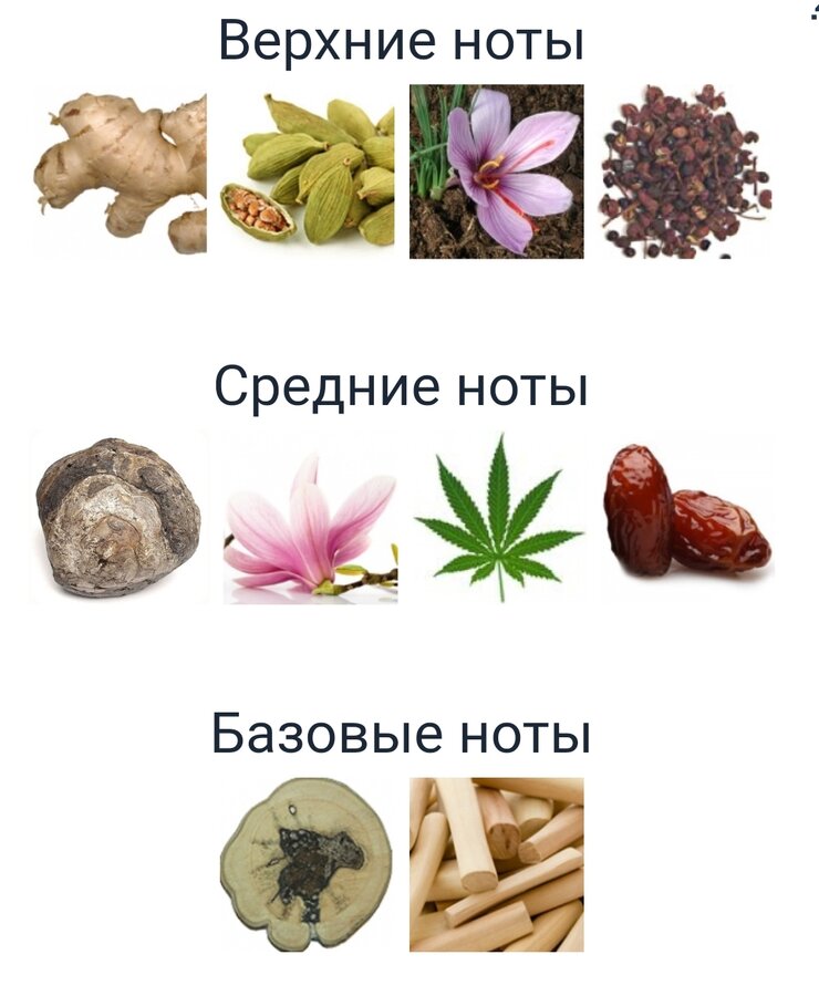 средние ноты: Шафран, Мускатный орех, Розовый перец, Ветивер, Кориандр и Герань;