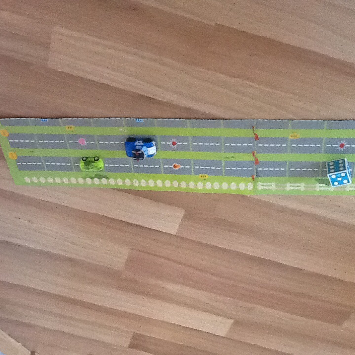 На фото модернизированный вариант игры, фишки-машинки, поле склеено в дорожку.
