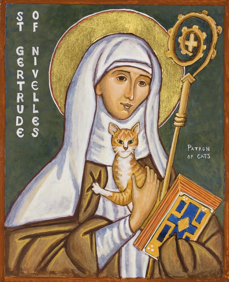 Это икона святой Гертруды Нивельской. Святая жила на территории современной Бельгии в VII веке. Считается покровительницей кошек. Поскольку в VII веке церкви еще не были разделены, она может почитаться и православными. Память совершается 17 марта.