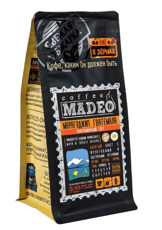 Марагоджип Гватемала кофе зерно 200гр свободно 1 шт 640 руб/шт Марагоджип Гватемала кофе зерно 500гр свободно 1 шт 1400 руб/шт Кофе с богатым букетом фруктовых и цветочных оттенков. Крупные зерна гватемальской арабики отличаются природно-пониженным содержанием кофеина. Во вкусе лёгкие острые нотки, тона корицы и сладкой выпечки. Природно-пониженное содержание кофеина: примерно 0,8 %.