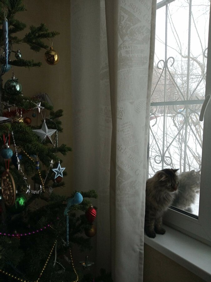 Это две разные кошки. Наша Муся в квартире и соседская Мася за окном.