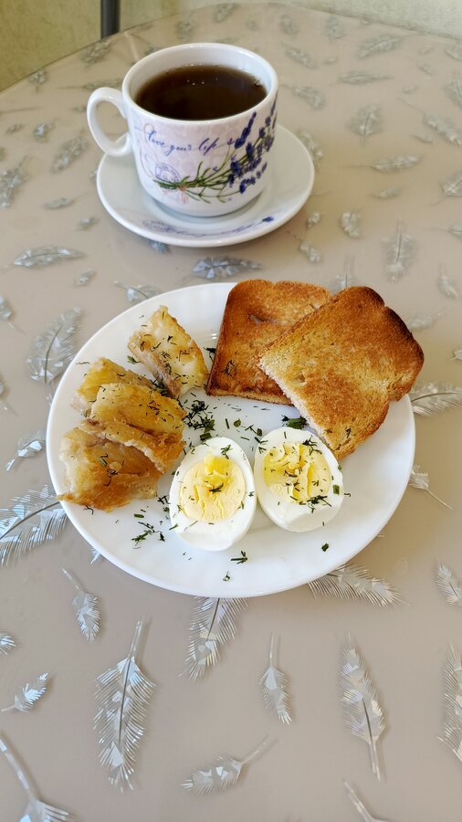 Яйцо, минтай, тосты для бутерброда с маслом и медом