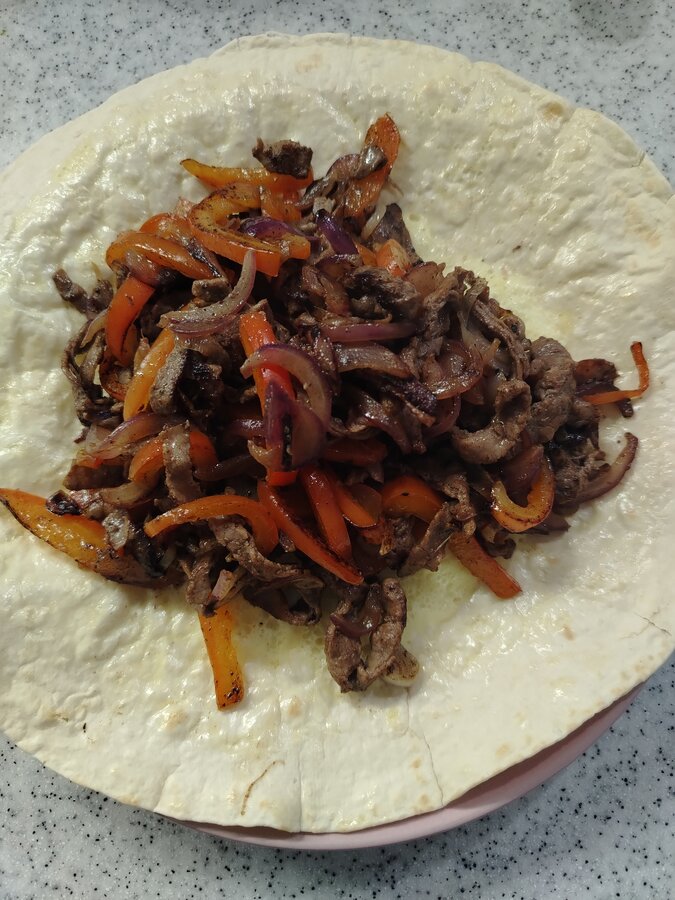 Тортилья с яйцом, говядиной, балнарским перцем и луком.