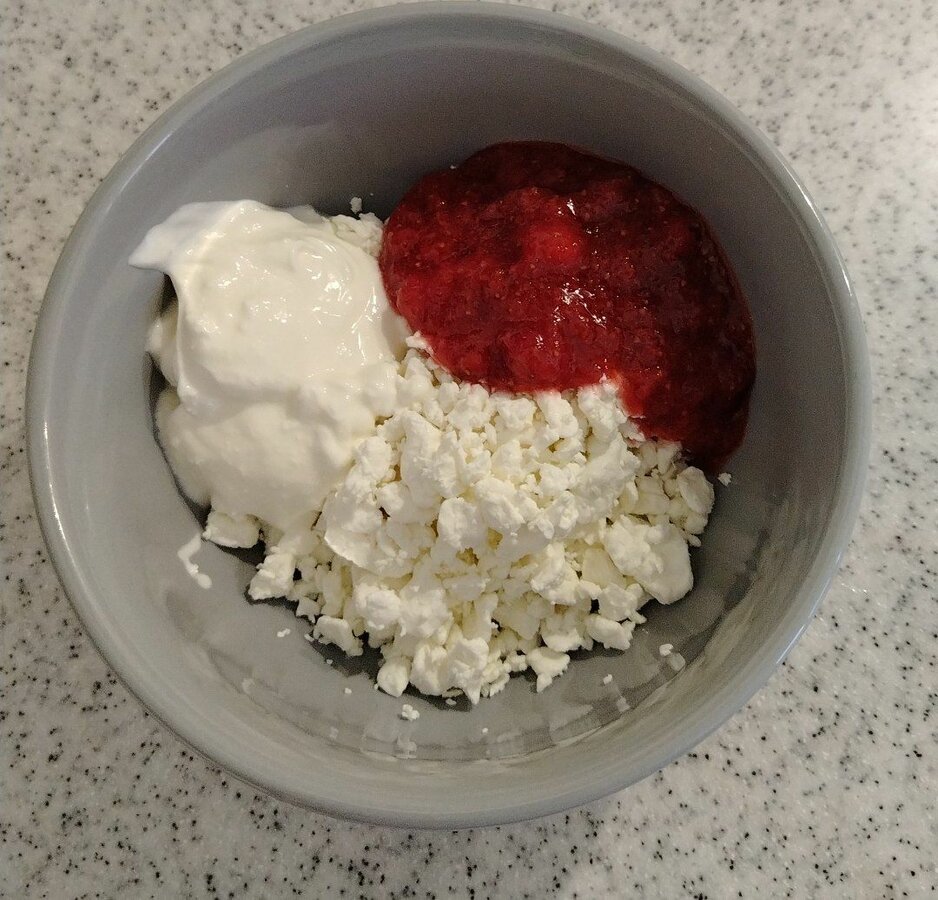 Сегодня захотелось творога, 100гр творога и по 5гр сметаны и варенья