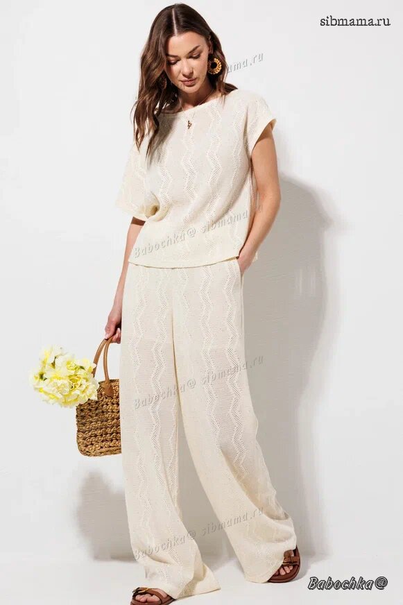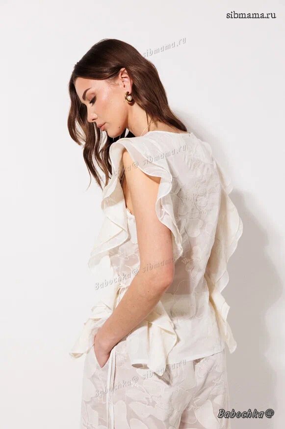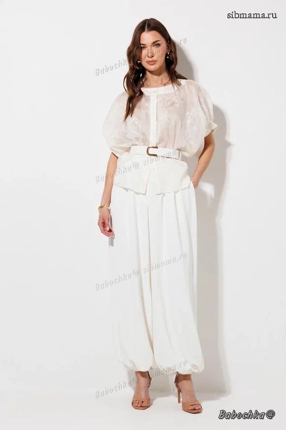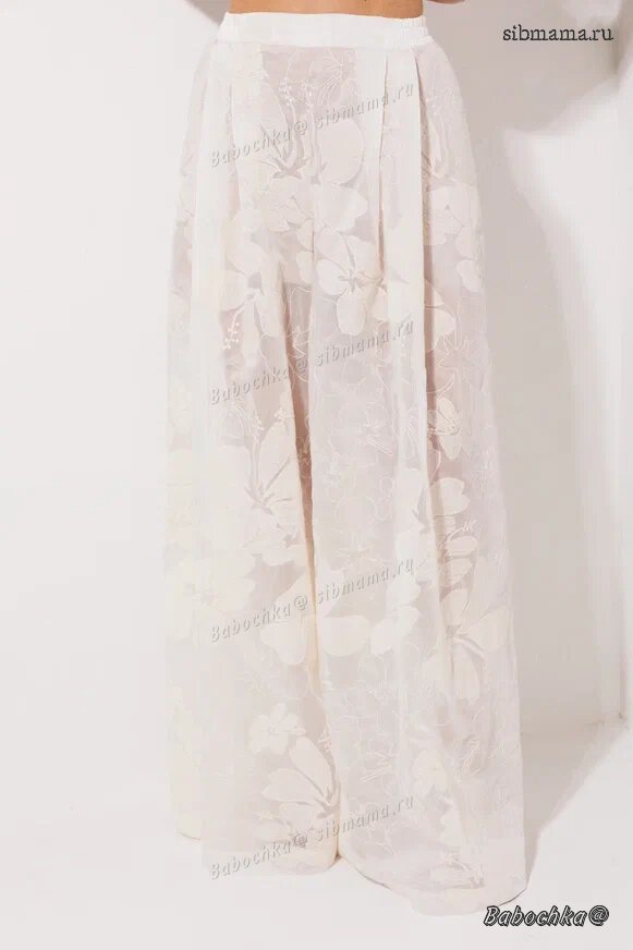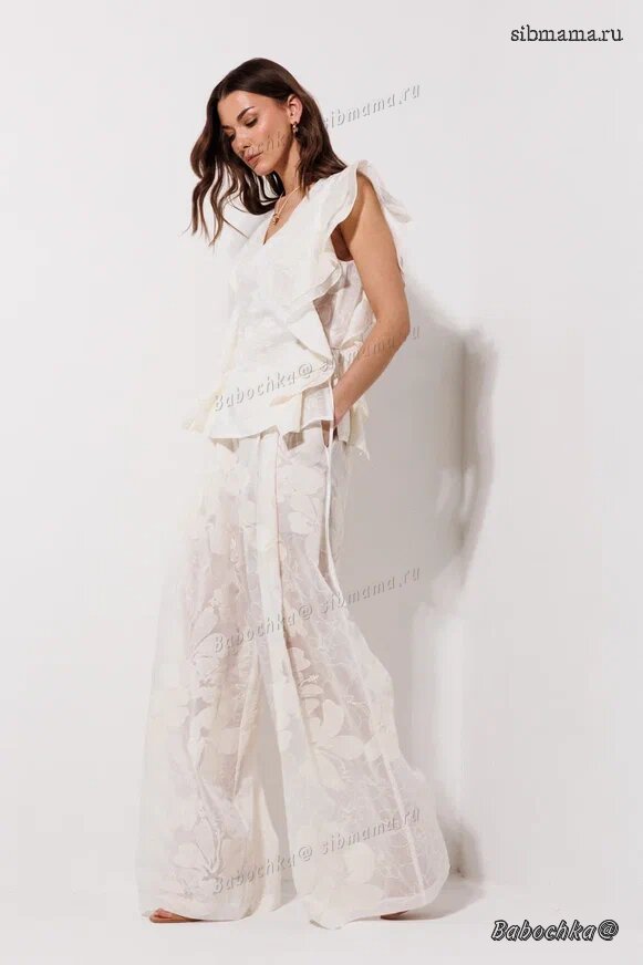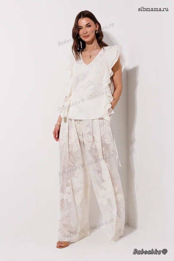 Элегантный костюм из блузки и брюк. Романтическая блузка из полупрозрачной натуральной ткани с нежной вышивкой прямого силуэта с вертикальными рельефами по переду и спинке, декорированными притачными воланами. Горловина переда с V-образным вырезом. Центральная часть переда на подкладке. В боковых частях блузки предусмотрены завязки для приталивания силуэта. Брюки прямого силуэта из полупрозрачной ткани с вышивкой. По верху брюк притачной пояс с эластичной тесьмой(резинкой). По переду предусмотрены декоративные складки и карманы. В брюках предусмотрена телесная подкладка в виде шорт!